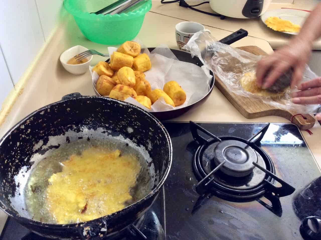 22. September 2017 Doña Morelias Patacón und Chicharrón 1280 × 956 Die frittierten Platanostücke werden flach geklopft. Die frittierten Platanostücke werden mit einem Stein flach geklopft. Die frittierten Platanostücke werden flach geklopft.